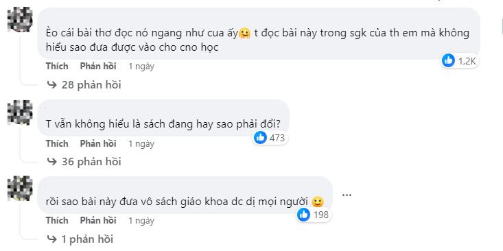 Bạn Trần Vũ Nguyên Khôi (lớp 11A17, trường THPT Nguyễn Du, TP.HCM) cũng cho biết: “Mình đọc thì thấy bài thơ này khá phá cách, sáng tạo, với cũng gần gũi nữa. Một số tác phẩm văn gây tranh cãi ở chương trình mới thì thường sẽ không phải kiểu điển hình trong tư duy nhiều người. Đó cũng là lý do bài thơ gây ra không ít ý kiến trái chiều”.