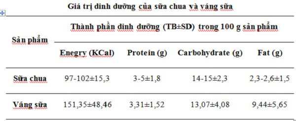 Bảng trên cho thấy, trung bình trong 100 g váng sữa có năng lượng là 151,35 ± 48,46 KCal, chất đạm là 3,31 ± 1,52 g, chất đường 13,07 ± 4,08 g và chất béo rất cao, là 9,44 ± 5,65 g. Trong tổng số 10 loại váng sữa đã quan sát, chỉ có 5 loại ghi thành phần vitamin A khoảng 120 mcg; 7 loại có can xi khoảng 120-130 mg; 4 loại có chất xơ khoảng 0,1-0,5 g; một số loại có Na khoảng 0,05-0,15 g; Không loại váng sữa nào trên bao bì có ghi thành phần Fe, vitamin A, vitamin E và Vitamin C. Một hộp váng sữa nguyên chất, chất béo chiếm đến trên 70% tổng năng lượng mà trẻ cần, cao gấp đôi so với chất béo trong một ly sữa thông thường của trẻ. Do đó, đây là nguồn cung cấp năng lượng rất cao, có thể dùng làm thức ăn tốt để điều trị suy dinh dưỡng, hoặc phục hồi cho trẻ mới ốm dậy. Tuy nhiên điều này không có nghĩa là “váng sữa có nhiều chất dinh dưỡng”. Trái lại, có thể nói váng sữa là một sản phẩm mất cân đối về năng lượng, quá giàu chất béo, quá ít chất đạm, rất nghèo chất khoáng và vi chất dinh dưỡng. Cần nhắc lại rằng, Tổ chức Y tế thế giới (WHO) đã khuyến nghị, trẻ cần được bú mẹ hoàn toàn trong 6 tháng đầu đời. Vì vậy, chỉ nên cho trẻ ăn các sản phẩm dinh dưỡng, cả sữa chua và váng sữa, phô mai,… sau 6 tháng tuổi khi trẻ đã ăn bổ sung, nhằm có thêm năng lượng, chất đạm, chất béo, chất khoáng và vi chất dinh dưỡng giúp trẻ phát triển tốt hơn. Nên luôn luôn ghi nhớ rằng, sữa chua và váng sữa không thể thay thế sữa, nhất là sữa mẹ, vì thành phần của nó không hoàn hảo được như sữa mẹ, đặc biệt là hàm lượng chất đạm và các vi chất cần thiết cho phát triển rất thấp. Nếu dùng bất cứ loại sản phẩm nào thay thế sữa mẹ, trẻ sẽ bị thiếu chất đạm, thiếu vi chất dinh dưỡng dẫn đến suy dinh dưỡng, thiếu máu, thiếu vitamin A, ... Tệ hơn nữa, nếu quá lạm dụng những sản phẩm năng lượng và chất béo cao như váng sữa cho những trẻ đã dư cân, trẻ sẽ sớm bị thừa cân, béo phì và các bệnh mạn tính nguy hiểm khác.