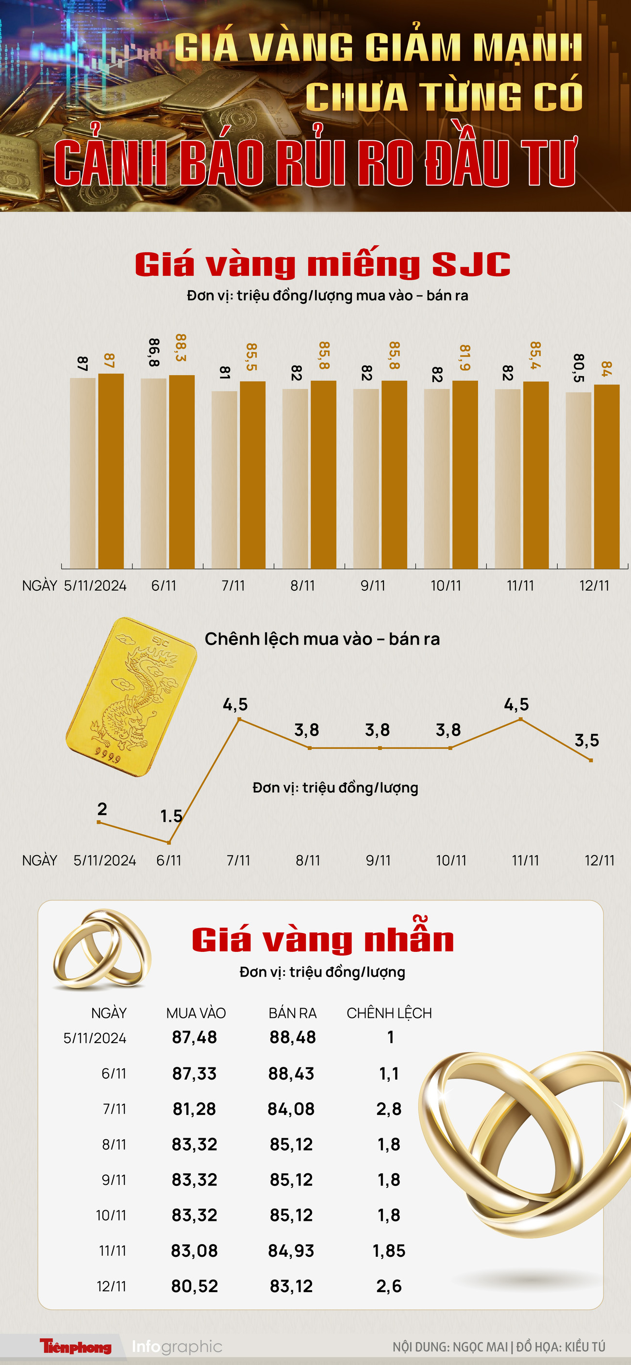 TPO - Chỉ trong vòng 1 tuần qua, giá vàng trong nước giảm mạnh chưa từng có theo giá thế giới. Các nhà vàng nới rộng khoảng cách mua vào - bán ra lớn nhất từ trước đến nay đẩy rủi ro cho nhà đầu tư.