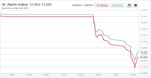 Công ty Vàng bạc đá quý Sài Gòn - SJC giữa giờ chiều nay cũng hạ giá bán xuống sát 32,87 triệu đồng một lượng. Riêng Công ty vàng bạc đá quý Phú Nhuận - PNJ công bố giá bán vàng miếng SJC cao hơn các đơn vị trên 80.000 đồng, dao động quanh 32,95 triệu đồng mỗi lượng, thấp hơn gần cả triệu đồng so với chiều hôm qua.