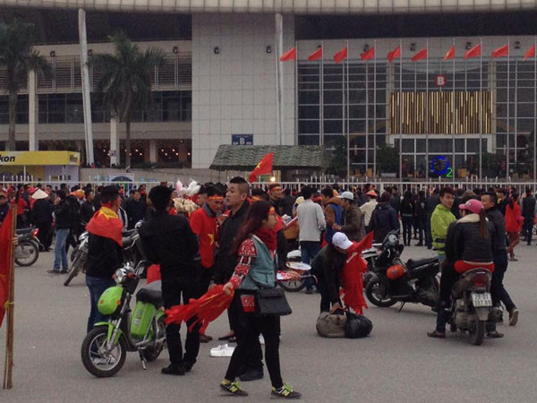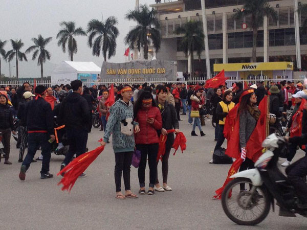 Rất đông người cũng tranh thủ bán các đồ cổ vũ như cờ, ruy-băng, ảnh… Một lá cờ lớn có cán giá 50.000 đồng/chiếc, cờ nhỏ 10.000 đồng, ruy-băng 10.000 đồng, dán mặt 5.000 đồng. Bạn Hoa, sinh viên Nhạc viện nói đã có mặt tại sân vận động từ 14h chiều.