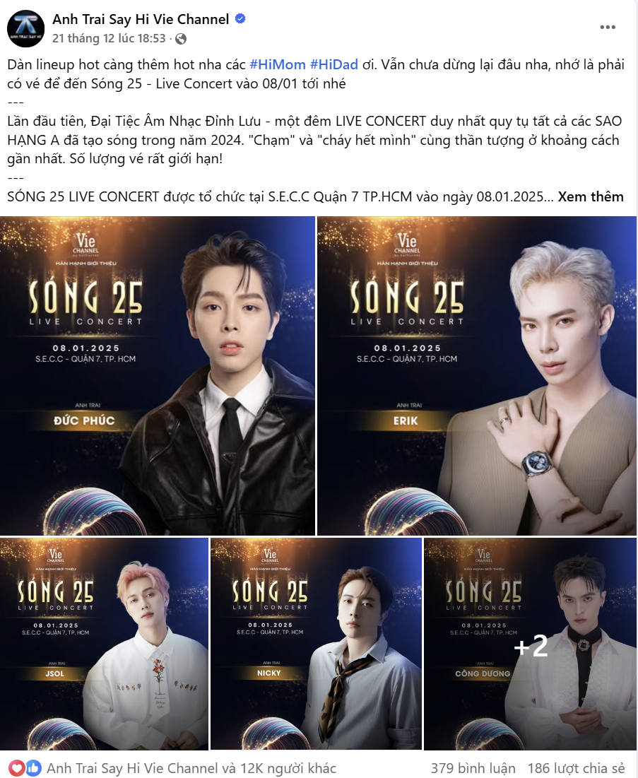 Sóng 25 - chương trình quen thuộc mỗi dịp Tết, năm nay đổi mới với format Live Concert, quy tụ dàn nghệ sĩ từ các show truyền hình thực tế ăn khách nhất nhì năm qua như Anh Trai "Say Hi", Rap Việt và Our Song. Chính sự tham gia của các nghệ sĩ nổi tiếng cùng kỳ vọng vào chất lượng chương trình đã khiến khán giả sẵn sàng "chốt đơn" ngay đợt mở bán sớm (early bird), bất chấp thời gian gấp rút và mức giá không hề nhẹ, dao động từ 2,5 triệu đến 10 triệu đồng.