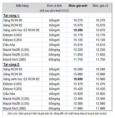 Giá bán này áp dụng tại hệ thống phân phối của Petrolimex trên lãnh thổ Việt Nam. Biểu giá cụ thể như sau: