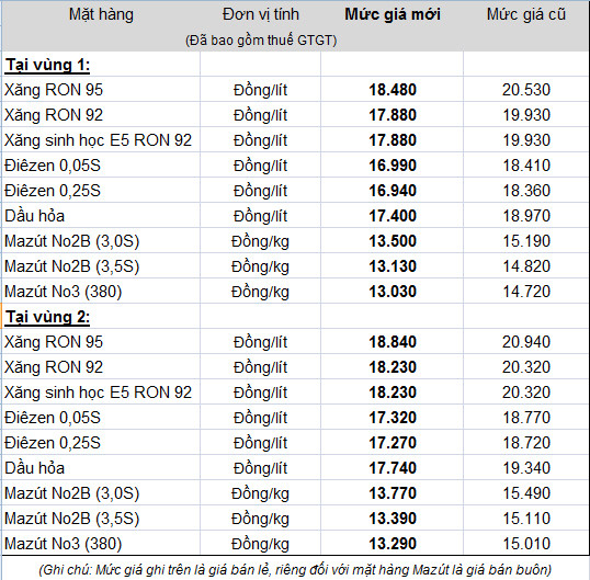 Theo đó, mức giá mới của xăng RON 92 là 17.880 đồng/lít, tương ứng với mức giá dành cho xăng sinh học E5. Xăng RON 95 có giá 18.480 đồng/lít. Dầu Diesel có giá 16.990 đồng/lít và dầu hỏa có giá 17.400 đồng/lít.