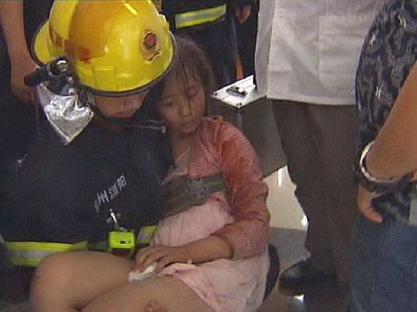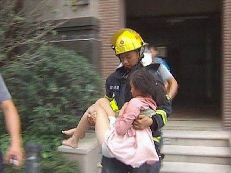 Nhân viên cứu hộ bế bé gái ra ngoài.
