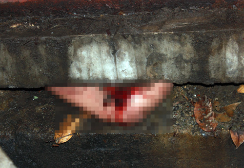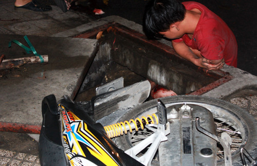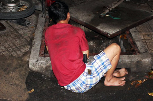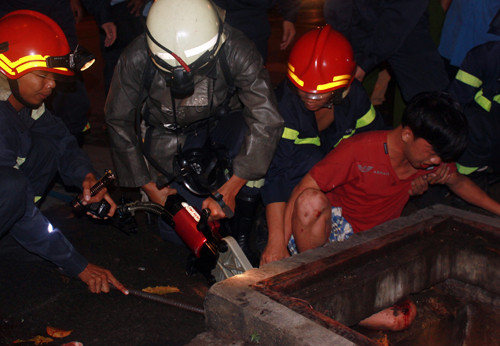 Riêng anh Đạt, phần khuỷu gối bị nêm chặt vào miệng cống thoát nước ở góc đường, không thể rút lên.