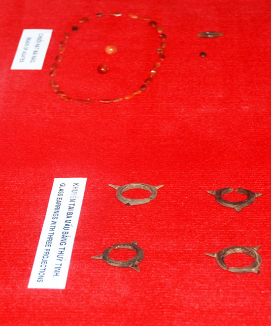 Hạt chuỗi bằng đá quý, khuyên tai hình vòng khăn bằng thủy tinh của cư dân Sa Huỳnh xưa. Các chuyên gia khảo cổ cho rằng, với những gì đã khai quật được có thể nói đời sống vật chất, tinh thần của cư dân Sa Huỳnh đã phát triển đạt trình độ cao. Cùng với văn hóa Đông Sơn, văn hoá Sa Huỳnh là một trung tâm văn minh rực rỡ thời kỳ đầu dựng nước.