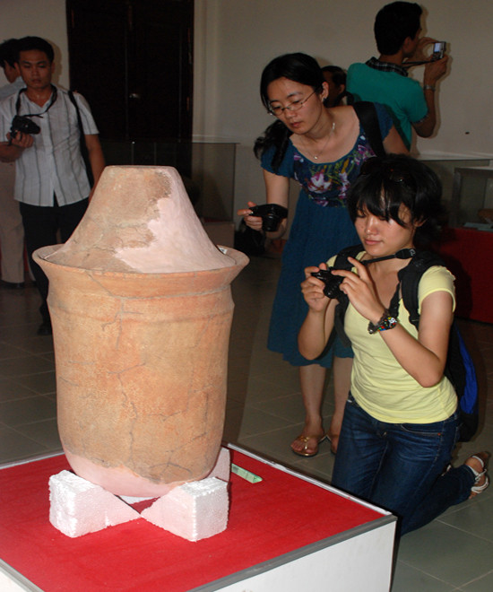 Du khách Nhật Bản tỏ ra ngạc nhiên trước mộ chum dạng hình trụ, đáy tròn được trưng bày ở Bảo tàng Tổng hợp Quảng Ngãi.