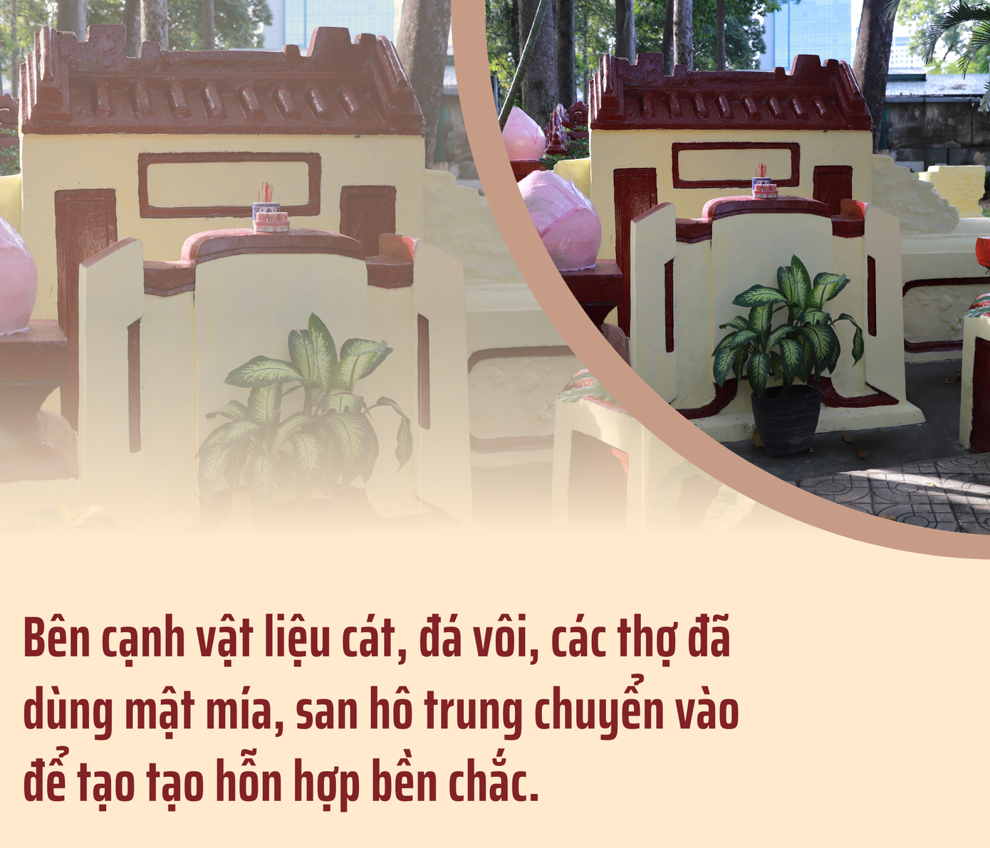 "Bên cạnh vật liệu cát, đá vôi, các thợ đã dùng mật mía, san hô trung chuyển vào để tạo hỗn hợp. Thợ phải đổ từng lớp một, rất mỏng, đợi khô mới có thể làm tiếp nên liên kết ngang vô cùng chắc chắn…", bà Nguyễn Thị Hà, giảng viên khoa Lịch sử trường Đại học KHXH&NV TPHCM chia sẻ.