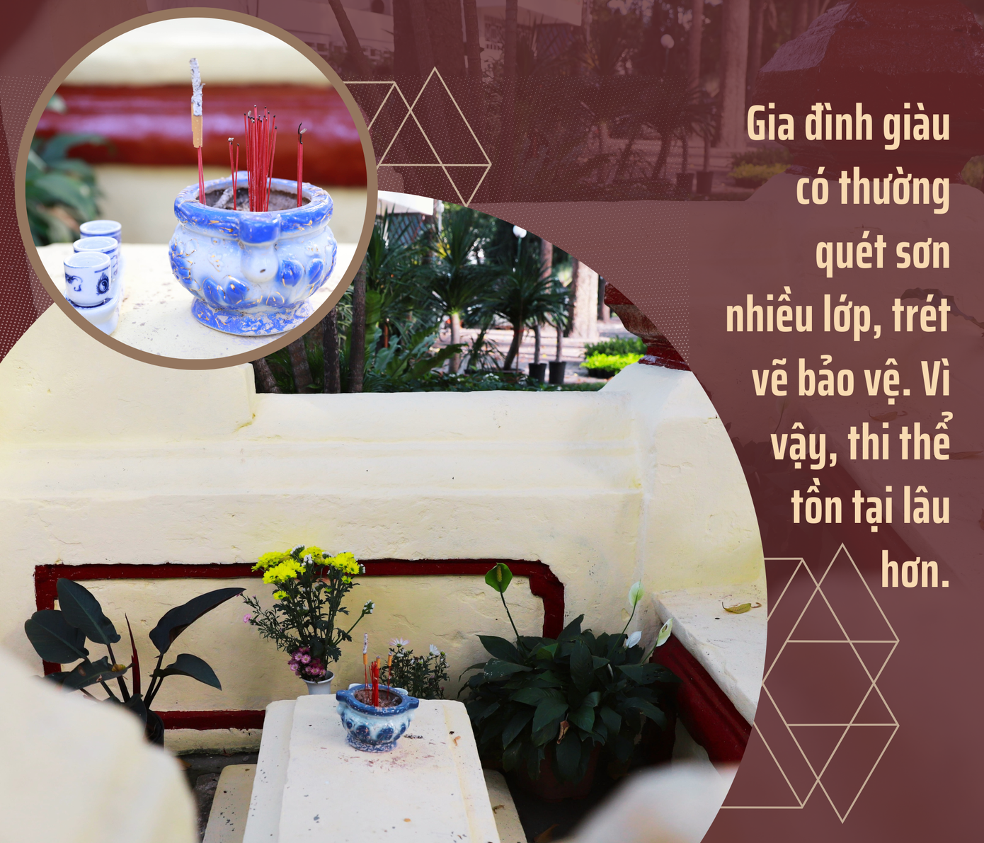 Thế nhưng, tùy điều kiện gia đình, nếu gia chủ khá thì quan đơn thuần là gỗ thôi. Nhưng nếu giàu có thì có thể quét sơn nhiều lớp, trét vẽ để bảo vệ. Vì vậy, những chiếc quan tài này thường bảo vệ thi thể tồn tại lâu hơn", vị thạc sĩ nói.