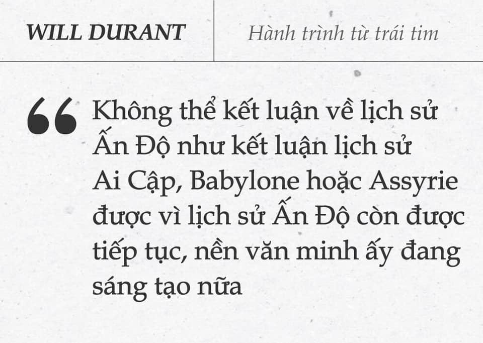 Nền văn minh ấy đã tạo nên một dấu ấn khó phai mờ như Will Durant đã viết: “Không thể kết luận về lịch sử Ấn Độ như kết luận lịch sử Ai Cập, Babylone hoặc Assyrie được vì lịch sử Ấn Độ còn được tiếp tục, nền văn minh ấy đang sáng tạo nữa.”