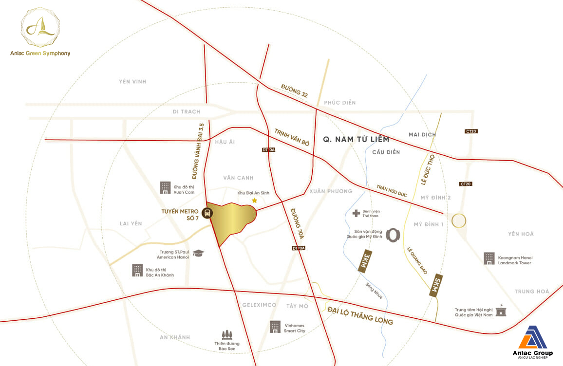 Anlac Green Symphony sở hữu vị trí đắc địa, tại “tâm điểm kim cương” tiếp giáp với hai luồng phát triển đô thị mới là Mỹ Đình và Hoài Đức. Đây cũng là vị trí kết nối trưc tiếp với các tuyến đường giao thông huyết mạch đã và đang hoàn thiện: đường Trịnh Văn Bô, đường nối đường Phạm Hùng (đường vành đai 3) với đường vành đai 3.5 huyện Hoài Đức, đường 70A; đồng thời ga của tuyến metro số 7 trọng điểm nằm ngay sát khu đô thị. Nhờ đó, cư dân sinh sống tại Anlac Green Symphony chỉ mất ít phút để di chuyển đến nội đô và các vùng lân cận.
