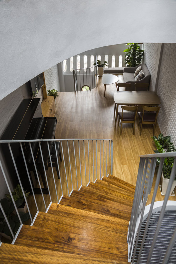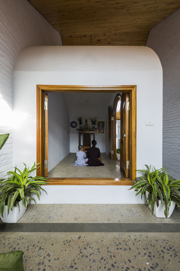 Gia chủ là một gia đình theo đạo Phật, mong muốn có một không gian thờ gia tiên và thờ Phật trang nghiêm, nên các kiến trúc sư đã thiết kế một phòng nhỏ trên tầng 4. Không gian bên trong được kết nối với thiên nhiên bên ngoài qua hệ cửa rộng, chan hòa ánh sáng và các bồn cây xanh.