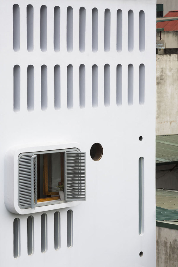 Mặt tiền được thiết kế có nhiều ô hình ô van để vừa thông gió và lấy sáng, vừa có tác dụng làm mờ một phần tầm nhìn từ những nhà đối diện do khoảng cách quá gần.