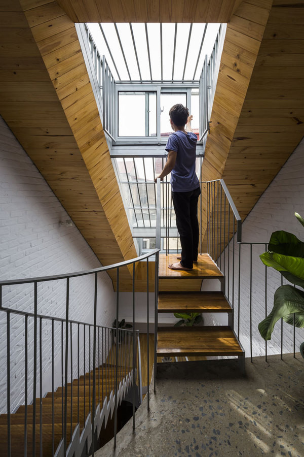 Những đặc điểm này thách thức các kiến trúc sư tìm giải pháp xử lý các góc cạnh trong nhà, vừa tạo ra không gian sống thông thoáng, vừa phải đảm bảo an ninh. Các kiến trúc sư đã thiết kế phần mái nhà là một mái vát dọc theo nhà ống. Phía sau nhà, nơi hướng gió Đông Nam rất mát vào mùa hè, được thiết kế thấp xuống tạo ra khoảng trống để ánh sáng và gió có thể dễ dàng vào được sâu bên trong.