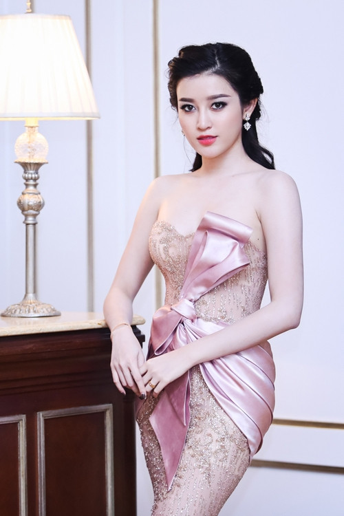Á hậu Huyền My diện váy xuyên thấu kết pha lê với gam màu pastel của nhà thiết kế Anh Thư. Trang phục theo đuổi mốt thắt nơ được ưa chuộng trong làng mốt thế giới hai năm qua.