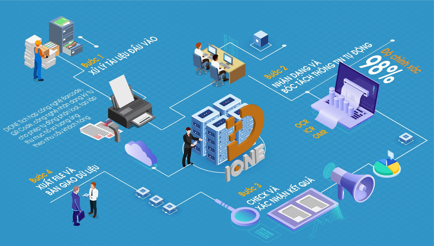 Phần mềm D-IONE cho phép quét, nhận dạng và tự động bóc tách dữ liệu, đồng thời tạo lập ra các cơ sở dữ liệu lớn, thuần Việt với độ chính xác cao và tiết kiệm đến 80% thời gian và chi phí cho khách hàng so với phương pháp truyền thống.