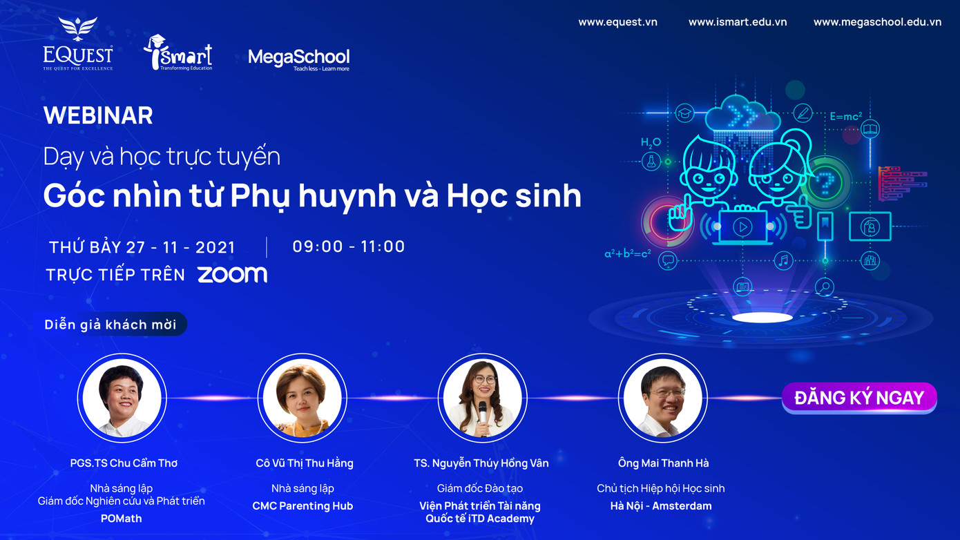 9h ngày 27/11/2021, iSMART Education sẽ tổ chức hội thảo trực tuyến "Dạy và học trực tuyến – Góc nhìn từ phụ huynh và học sinh" với sự tham gia của các chuyên gia giáo dục, nhà giáo, nhà tâm lý, phụ huynh, học sinh… hứa hẹn sẽ mang đến những thông tin bổ ích cho phụ huynh và học sinh trong giai đoạn học trực tuyến. Link đăng ký tại đây.