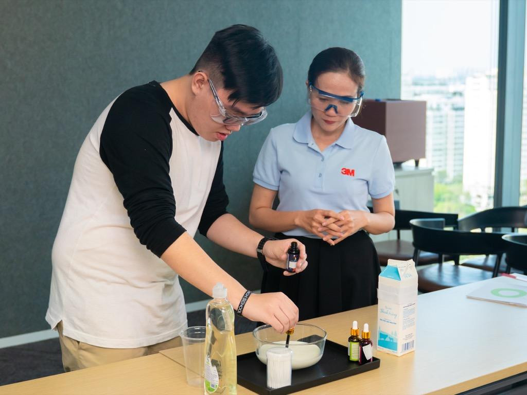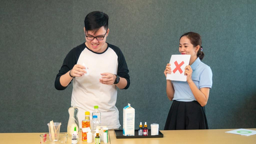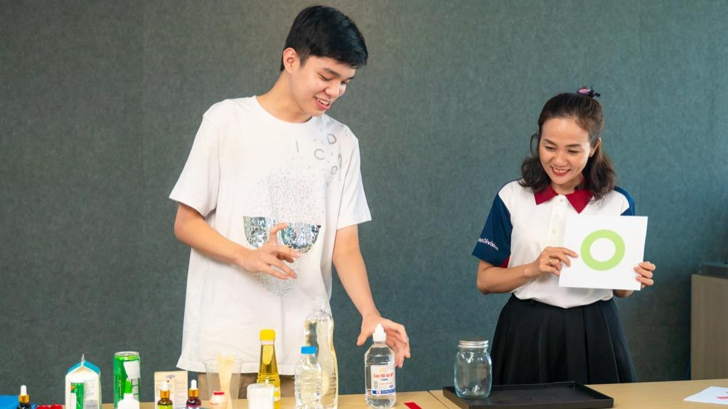 Hai chàng trai cũng có dịp trực tiếp trải nghiệm các phản ứng hóa học, đưa ra sự hướng dẫn đơn giản giúp các bạn nhỏ lẫn người lớn dễ dàng làm tại nhà. Chỉ sử dụng những nguyên liệu và dụng cụ sẵn có tại nhà như sữa, tăm bông, nước rửa chén, Nhựt Thịnh và Duy Anh khám phá được những thí nghiệm khoa học thú vị ngay tại không gian sống mà không tốn quá nhiều chi phí.