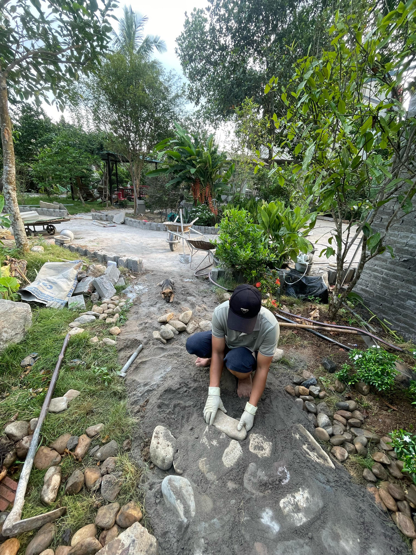 Họ cũng tận dụng tối đa cây cối trong vườn, giữ lại các loại cây ăn quả, trồng thêm một số cây và hoa mới từ cây giống nhỏ hoặc hạt gieo để tiết kiệm chi phí. Đồng thời, triển khai một số hạng mục như đào suối, làm bờ kè bằng đá, thiết kế lối đi…