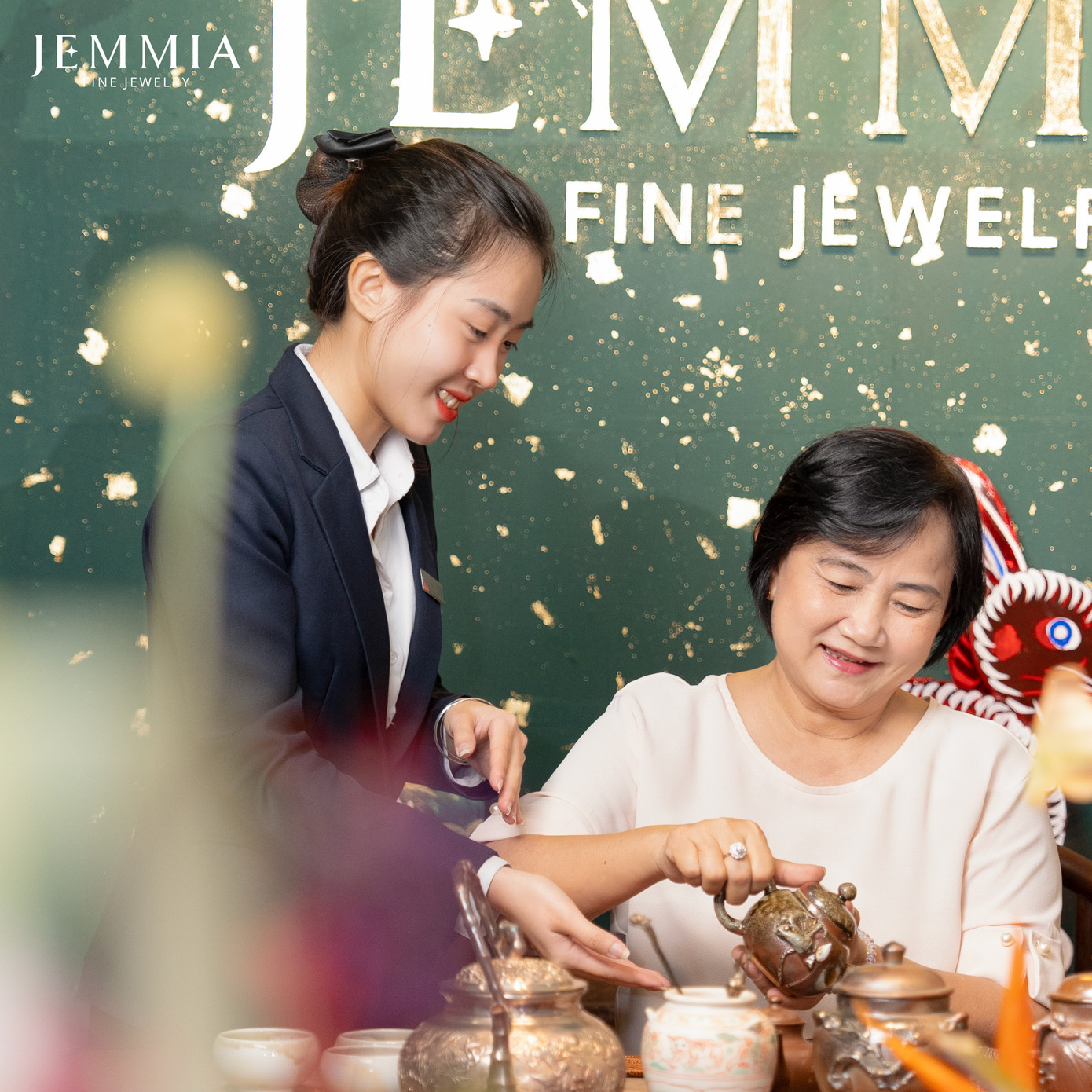 Đặc biệt, tại Jemmia xây dựng mỗi showroom có một phòng trà, hay còn gọi là trà thất, nơi đây được thực hiện 100% bởi nghệ nhân Việt và bằng phương pháp thủ công cổ. Khách hàng đến đây không chỉ mua kim cương mà còn được tận hưởng không gian đậm chất văn hóa và vô cùng ấm cúng, sang trọng.