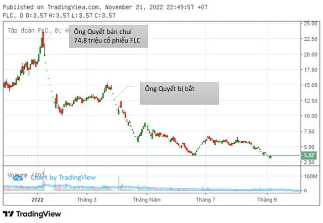 Trong năm 2022, các cổ phiếu ‘họ’ FLC đã trải qua 2 đợt suy giảm mạnh, đợt đầu tiên là vào ngày 10/1 khi ông Quyết bán chui 74,8 triệu cổ phiếu FLC, khi giá cổ phiếu đang có dấu hiệu phục hồi, tin ông Trịnh Văn Quyết bị bắt tạm giam để điều tra hành vi Thao túng thị trường chứng khoán tiếp tục là một “đòn giáng” mạnh khiến giá cổ phiếu tiếp tục giảm.