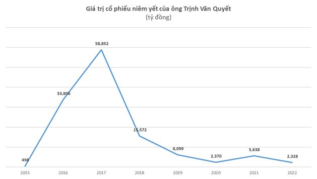 Thời điểm đó, ông sở hữu 318,5 triệu cổ phiếu ROS, 135,3 triệu cổ phiếu FLC và 2,6 triệu cổ phiếu ART. Đây chính là giai đoạn vàng của ROS, ART khi thị giá 2 cổ phiếu trên ở mức đỉnh lịch sử của nó. Tuy nhiên từ sau năm 2018, tài sản của ông Quyết trên sàn chứng khoán giảm dần, nguyên nhân chủ yếu do thị giá cổ phiếu trượt dốc và cũng bán bớt cổ phần. Khối tài sản của ông Quyết hiện nay chỉ còn bằng 4% khi ở đỉnh cao.