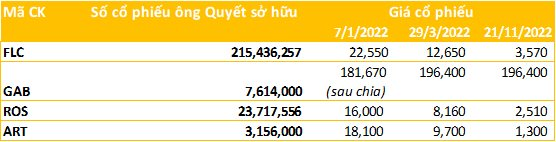 Với giá trị các cổ phiếu hiện nay là FLC 3.570 đồng/cp, GAB 196.400 đồng/cp, ART 1.300 đồng/cp và ROS trước khi hủy niêm yết là 2.510 đồng/cp, giá trị tài sản chứng khoán thời điểm hiện tại của ông Trịnh Văn Quyết khoảng 2.328 tỷ đồng.