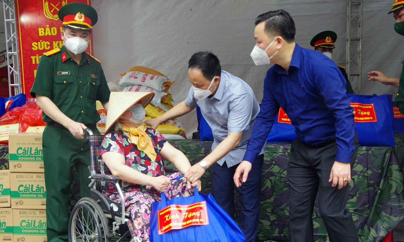 Phó Chủ tịch Ủy ban MTTQVN TP Hà Nội Nguyễn Sỹ Trường cùng đại diện lãnh đạo quận Hai Bà Trưng đã trao tặng 380 suất quà cho các hộ dân có hoàn cảnh khó khăn trên địa bàn do dịch COVID-19. Mỗi suất quà trị giá 300 nghìn đồng, gồm gạo, dầu ăn, miến, mì chũ, măng, nước mắm…
