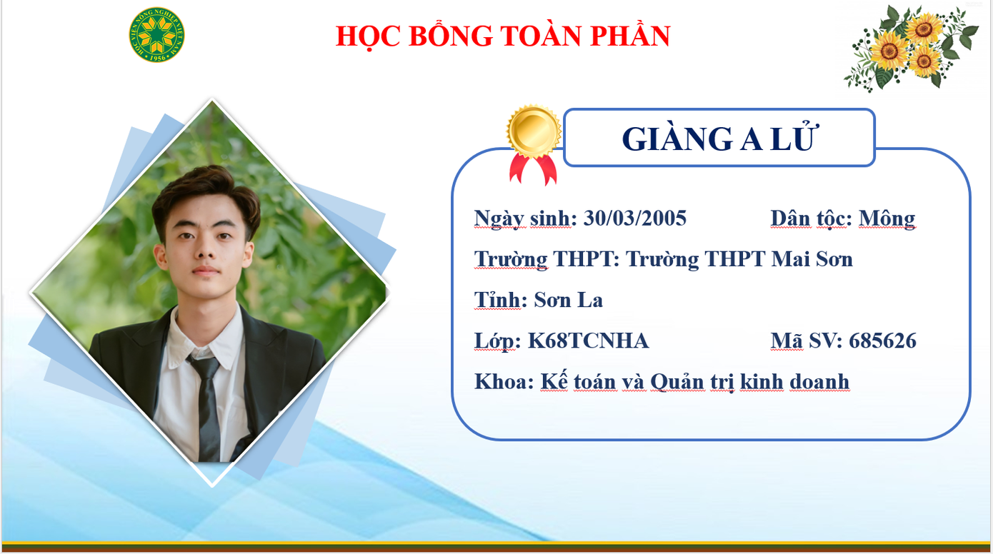 Với sự nỗ lực và phấn đấu, Giàng A Lử đã vinh dự nhận được học bổng toàn phần của Học viện tại Lễ Khai giảng năm học 2023 - 2024. Với học bổng toàn phần này, A Lử sẽ được miễn 100% học phí, miễn tiền ở nội trú Ký túc xá, được cấp tiền sinh hoạt phí hằng tháng. Đây là món quà vô cùng ý nghĩa, góp phần hiện thực hóa ước mơ của A Lử “sau khi tốt nghiệp sẽ có được một công việc ổn định để có thể tự lo được cho bản thân và giúp đỡ được cho gia đình và xã hội”.