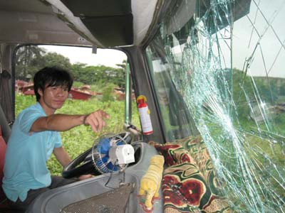Chỉ vào đống gạch đá, chai thuỷ tinh và kính vỡ còn nguyên trên cabin, anh Tuấn nói: “Đám thanh niên đó ném bất cứ thứ gì vớ được. May mà tôi né được, người không ảnh hưởng gì. Còn xe ít nhất phải mất 25 triệu đồng để sửa”.
