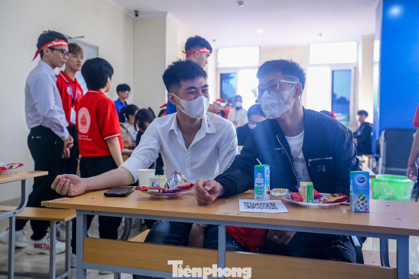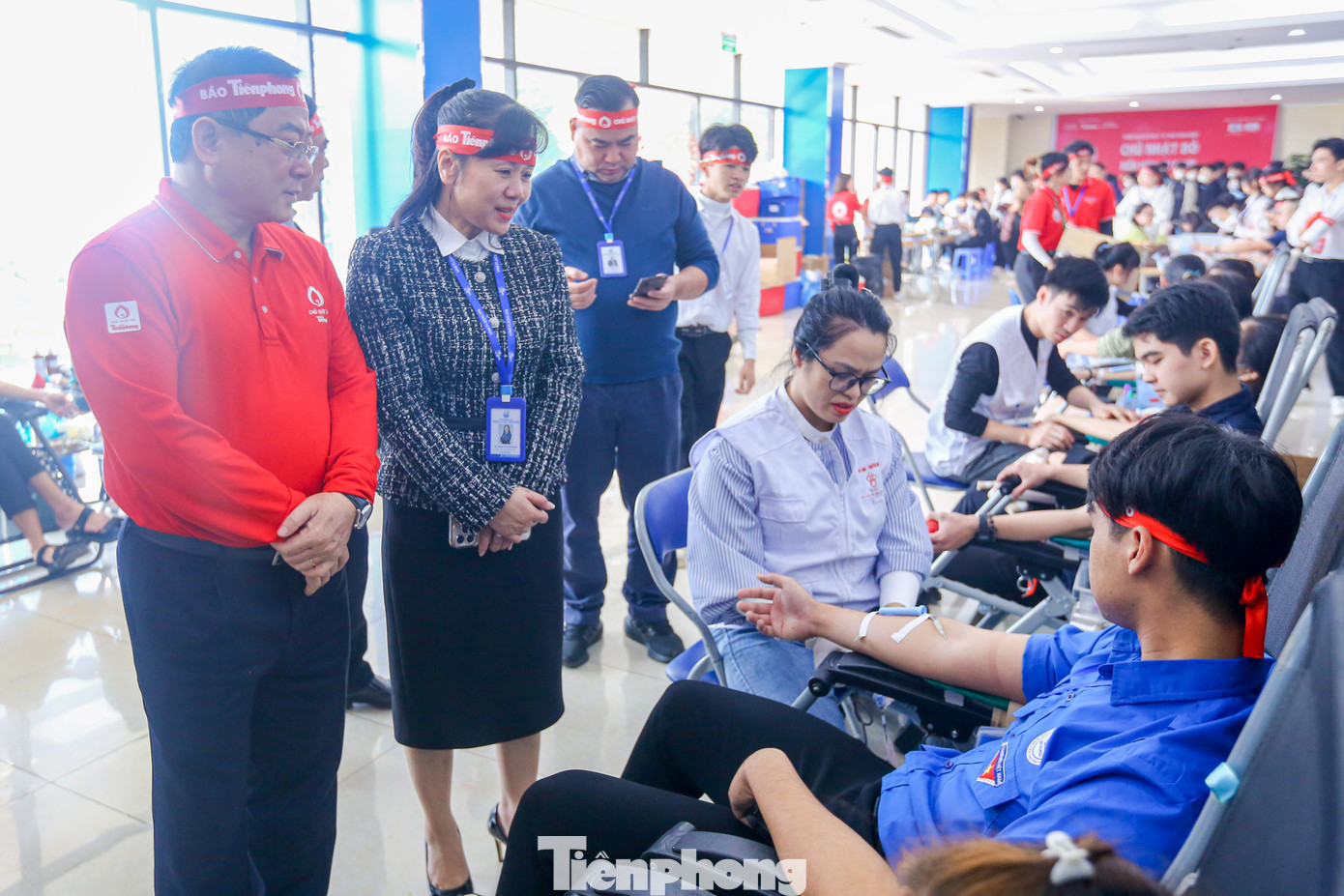 | Nhà báo Lê Xuân Sơn - Tổng Biên tập Báo Tiền Phong; TS Phạm Thị Thu Hoài - Chủ tịch Hội đồng Trường; TS Nguyễn Ngọc Khương, Phó Hiệu trưởng nhà Trường thăm, động viên người tham gia hiến máu. |