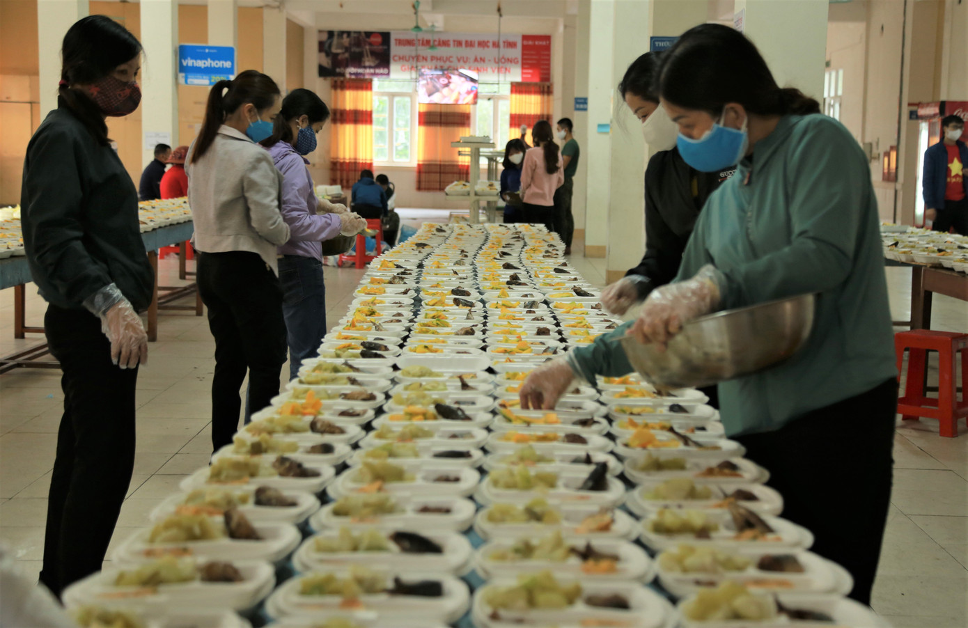 Mỗi ngày, tại khu cách ly điểm trường Đại Học Hà Tĩnh chuẩn bị gần 1.000 suất cơm phục vụ người cách ly.