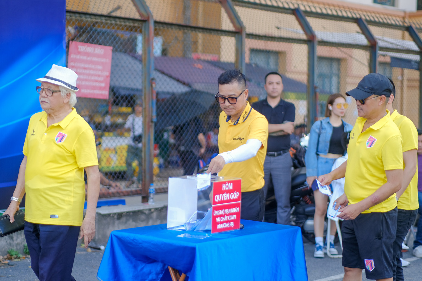 | Ông Hà Huy Thành, chủ tịch CLB FC Nhâm Tuất 1982 công bố tổng số tiền kêu gọi được sau trận đấu là 428 triệu đồng. |