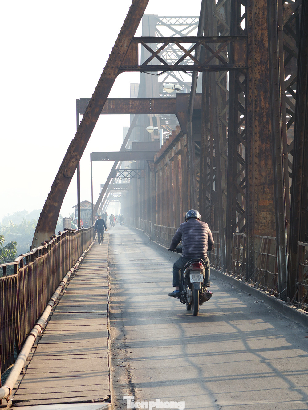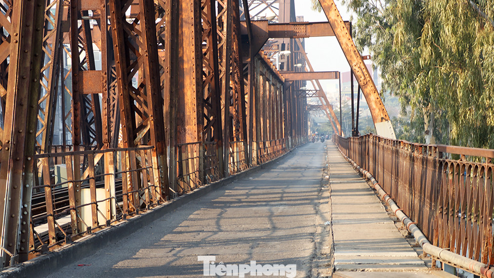 Cầu Long Biên tấp nập phương tiện qua lại hàng ngày, nay vắng vẻ yên bình.