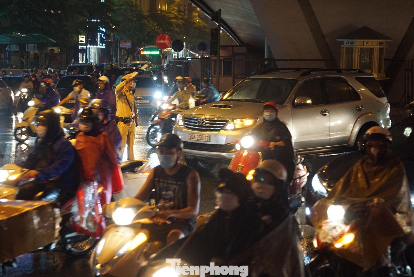 Tại nút giao Ngã Tư Sở, lưu lượng phương tiện di chuyển qua rất lớn khiến khu vực này luôn trong tình trạng kẹt cứng phương tiện. Dù có lực lượng CSGT phân luồng, hướng dẫn nhưng nhiều người điều khiển phương tiện vội vã tránh mưa khiến tình hình giao thông lộn xộn.