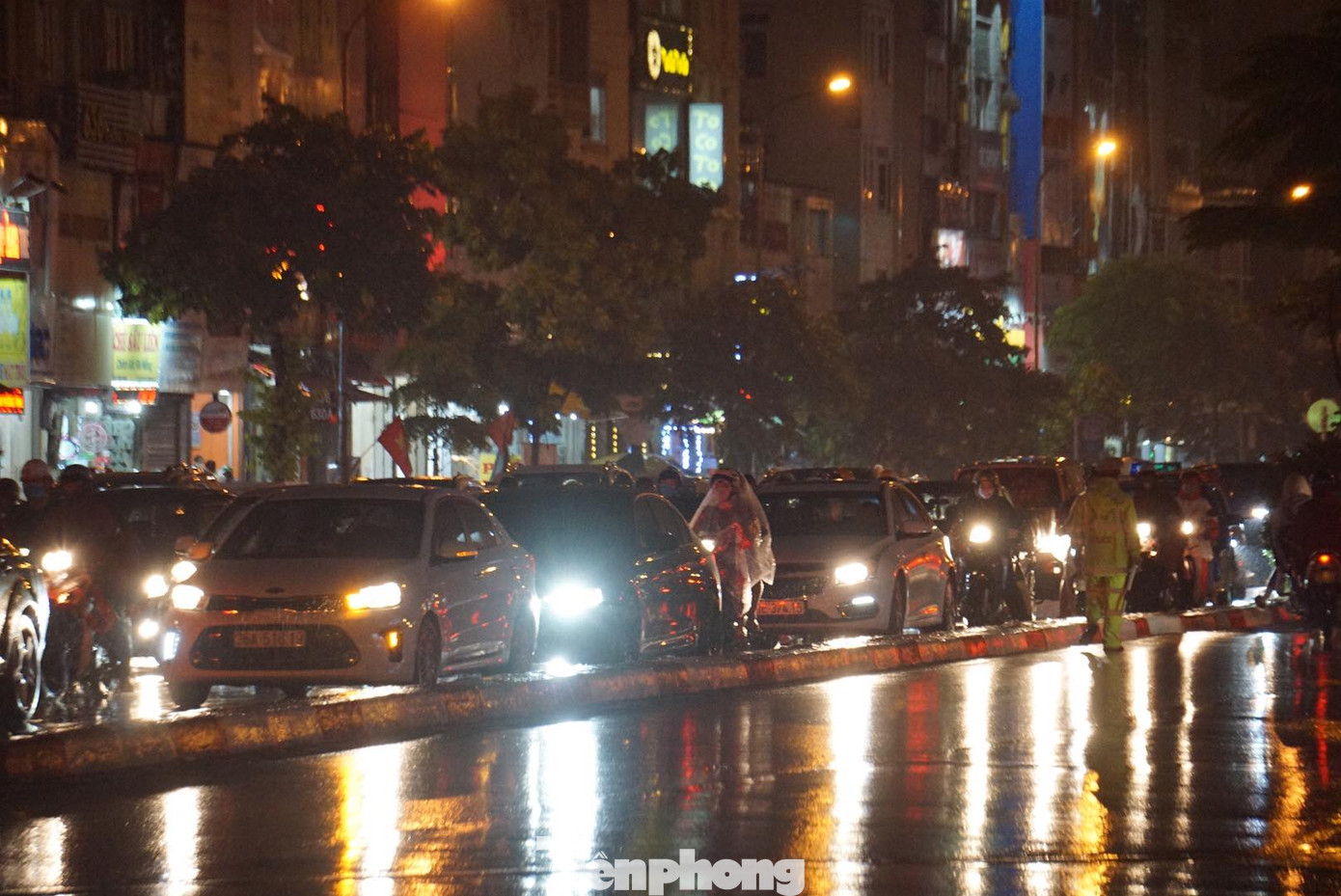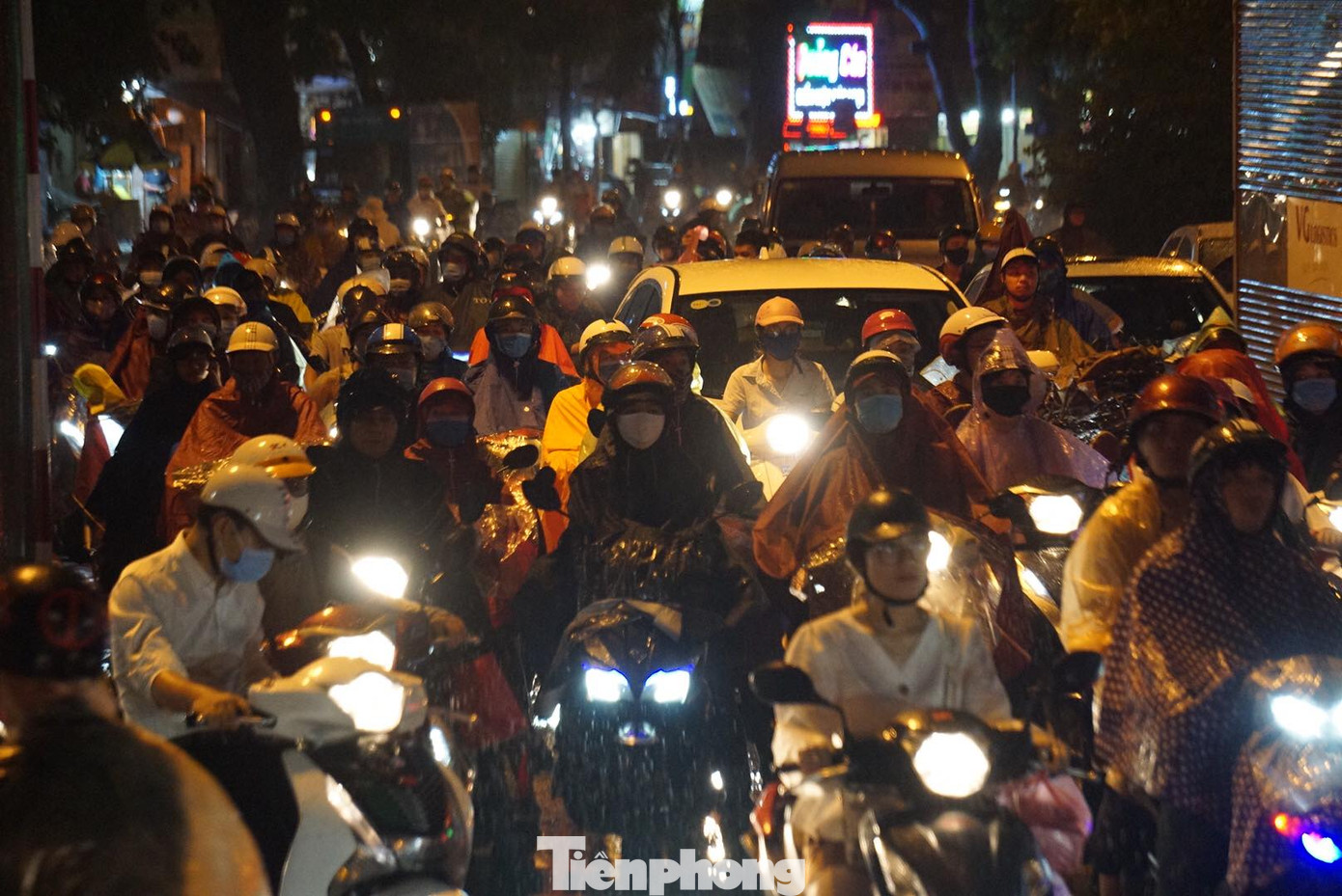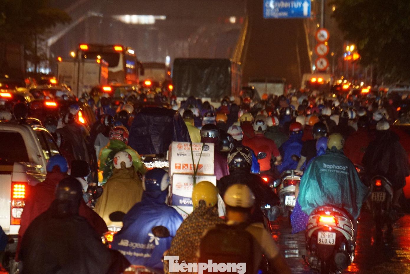 Hàng trăm phương tiện nối đuôi nhau dọc đường Láng - Ngã Tư Sở giữa trời mưa.