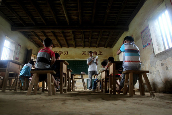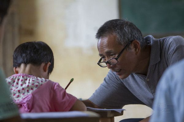 Thầy Zeng kiên trì giúp một trong số các em học sinh của mình hoàn thành bài tập về nhà. Ông là người chuẩn bị các bài giảng trong lớp học cũ kỹ này và cũng là người truyền đạt kiến thức đó cho các em nhỏ.