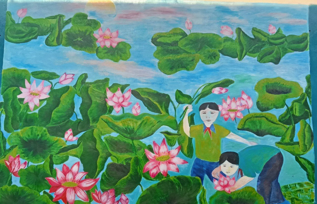 | Cô giáo trên địa bàn tỉnh Đồng Tháp vẽ tranh bích họa về sen. Ảnh: BTC |