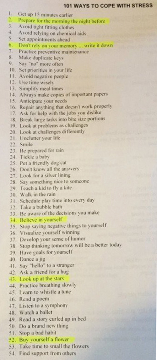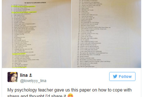 Alina Ramirez, học sinh năm cuối trung học ở Oxnard, California (Mỹ) đã đăng tải trên Twitter bức ảnh chụp danh sách “101 cách để đối phó với căng thẳng” vào ngày 2/9 và cho biết giáo viên tâm lý đã phát tờ hướng dẫn đó.