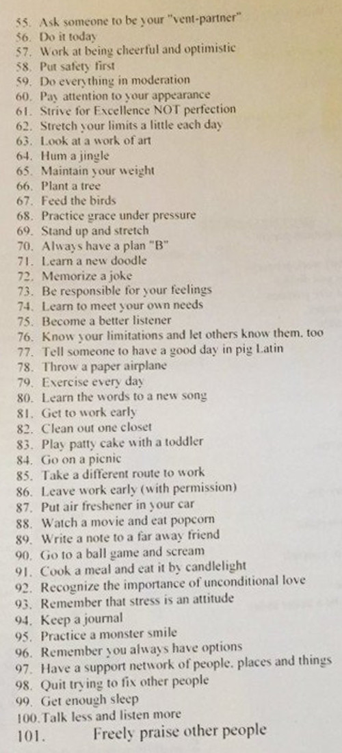 Danh sách gồm những lời khuyên cụ thể như thức dậy sớm 15 phút, nói điều gì đó tốt đẹp với ai đó và nuôi một chú chó/mèo thân thiện, cùng với những lời khuyên bao quát hơn như biết giới hạn của bản thân và cũng cho người khác biết điều đó.