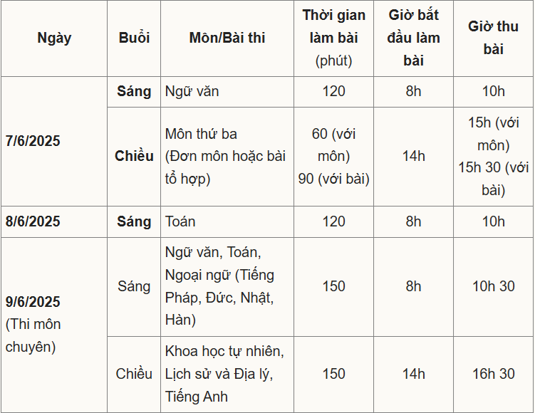Lịch thi vào lớp 10 THPT tại Hà Nội năm học 2025-2026 như sau: