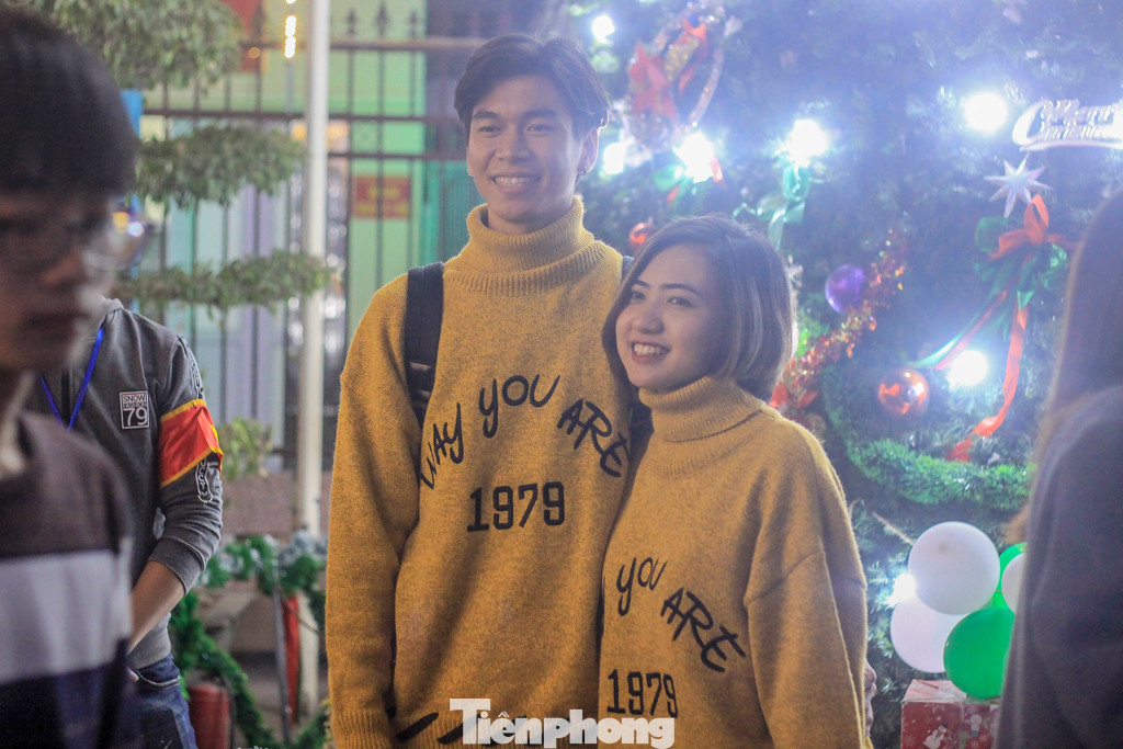 Đôi bạn trẻ chụp ảnh check in tại cây thông Noel trong nhà thờ.