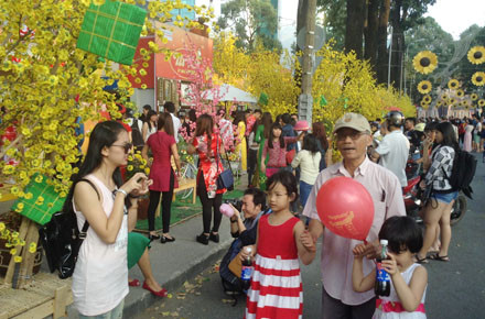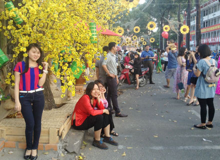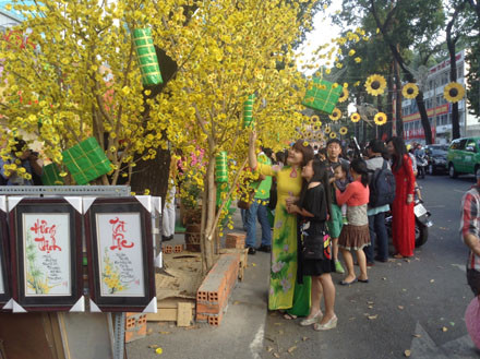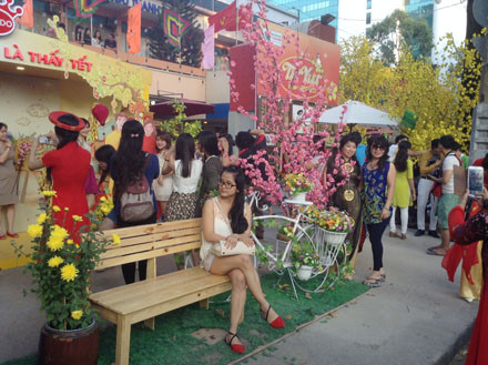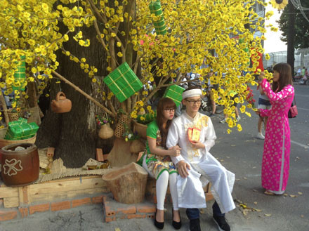 Nhiều cặp trai gái tay trong tay xuống phố chụp hình bên những cành mai vàng, những cành đào hồng thắm.