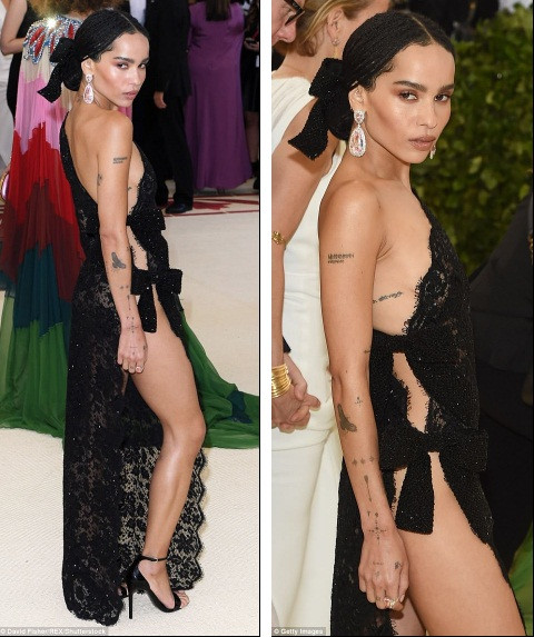 Nữ diễn viên, ca sĩ, người mẫu Mỹ 29 tuổi Zoe Kravitz cũng táo bạo không nội y với bộ cánh ren đen trông chẳng khác nào rèm cửa buộc vội che thân.