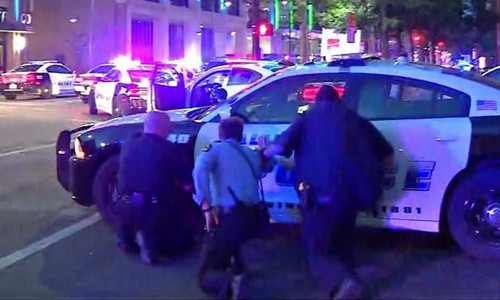 Lực lượng phản ứng nhanh của cảnh sát có mặt càng lúc càng nhiều, đấu súng suốt 45 phút với những kẻ bắn tỉa, và triển khai một lực lượng truy lùng lớn. Họ tuyên bố đã bao vây một tòa nhà, bắt giữ một nghi phạm, còn nghi phạm còn lại đang bỏ trốn. Cảnh sát trưởng Dallas tin rằng hai tay súng đã chọn địa điểm trên cao, nã đạn vào cảnh sát để gây ra thương vong lớn nhất có thể. Ít nhất 11 cảnh sát đã trúng đạn, trong đó có 4 người thiệt mạng.