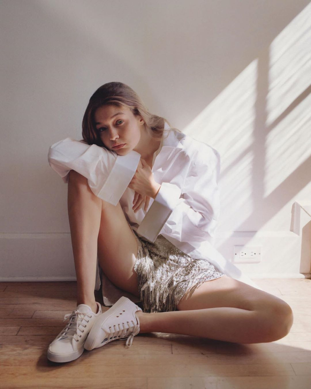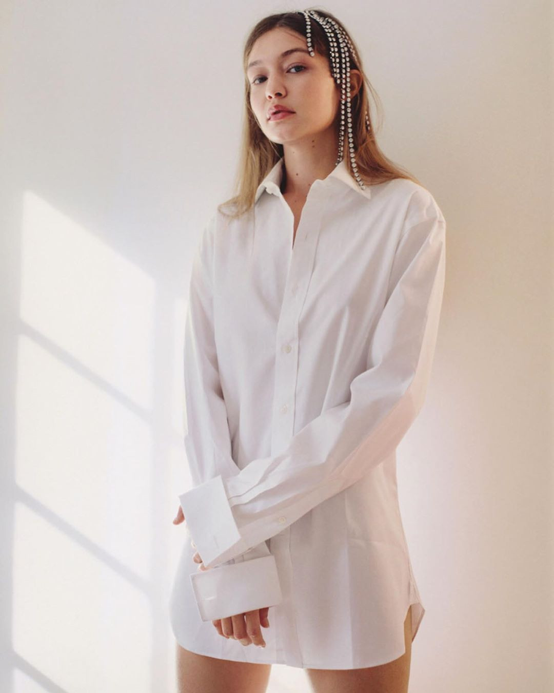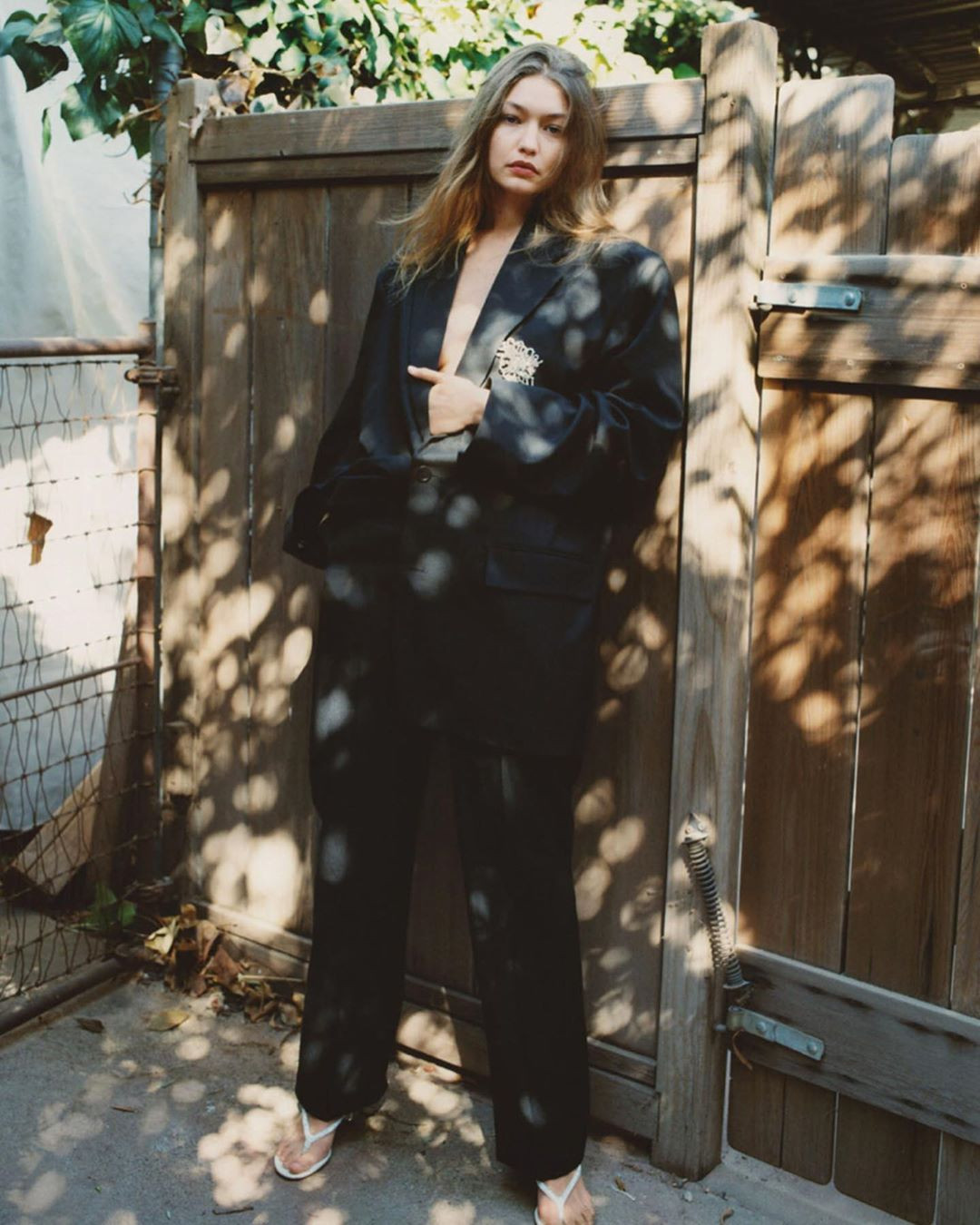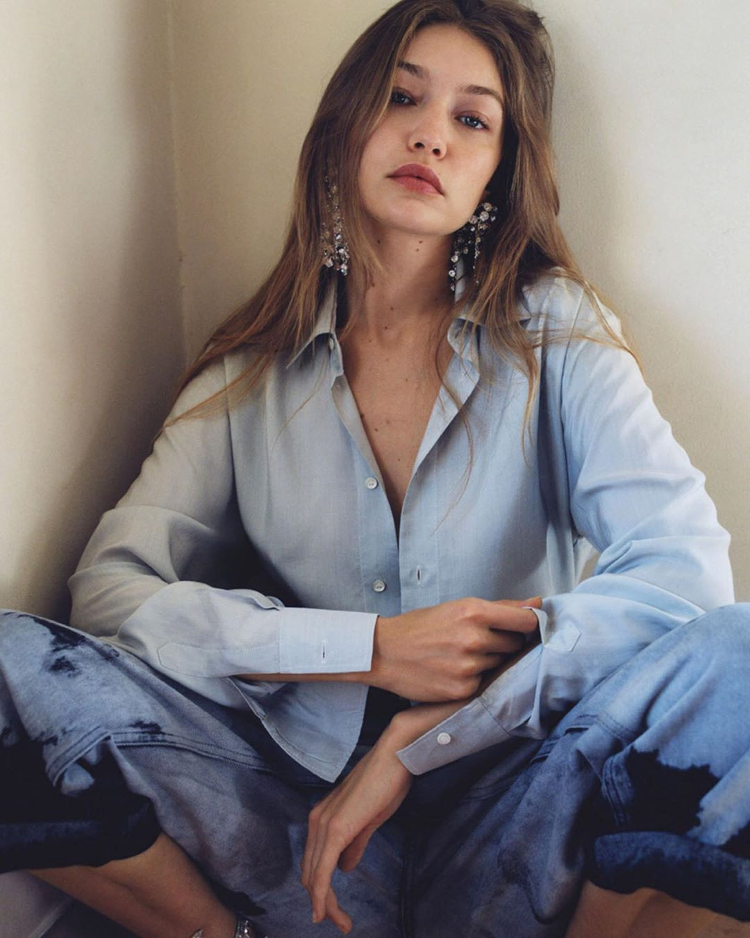 Gigi Hadid cởi áo bán nude che ngực trần, diện quần jeans rách cool ngầu ấn tượng.