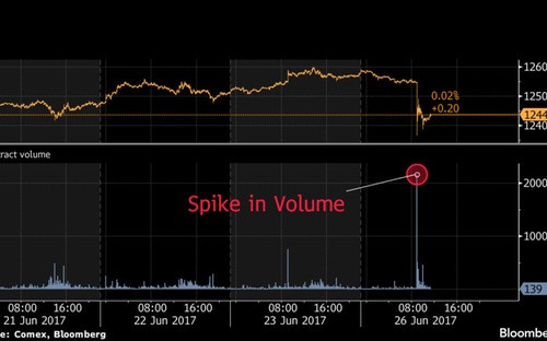 Vào thời điểm xảy ra cú rơi khó giải thích của giá vàng phiên ngày 26/6, khoảng 18.149 lô đã được giao dịch trên sàn COMEX ở New York trong vòng 1 phút. Một giờ sau, khối lượng giao dịch giảm về mức 2.334 lô.