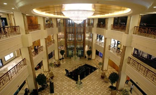 Đây là hình ảnh bên trong trung tâm thương mại Emporio tại New Delhi, Ấn Độ. Với trần nhà dát vàng, các đài phun nước hùng vĩ và những ly champagne hảo hạng, Emporio Mall là lựa chọn lý tưởng cho những ngày nóng bức.