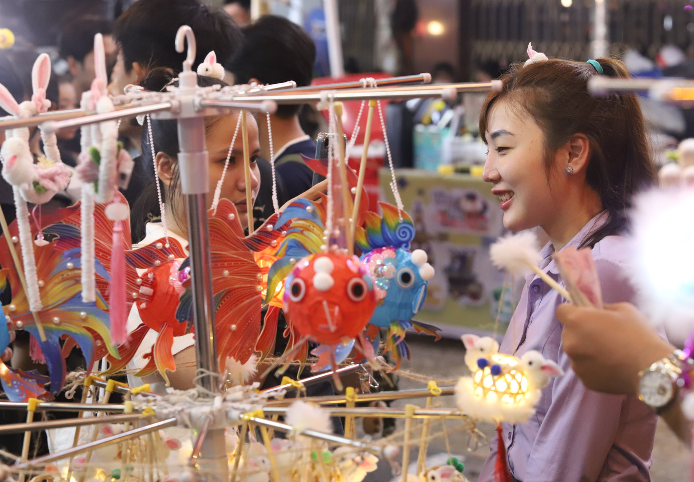 | Trong đêm chính hội Trung thu, dòng người nối nhau vui chơi, mua sắm đến tận khuya. |